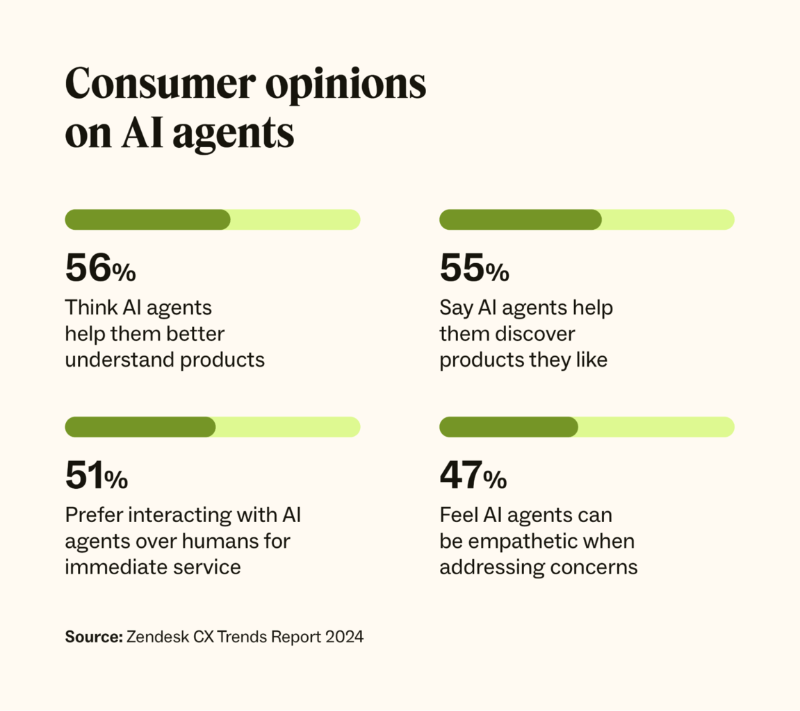 According to Zendesk’s 2024 CX Trends Report, over half of consumers say AI helps them better understand and discover products, and 51% would rather talk to a bot than a human when they need help fast.