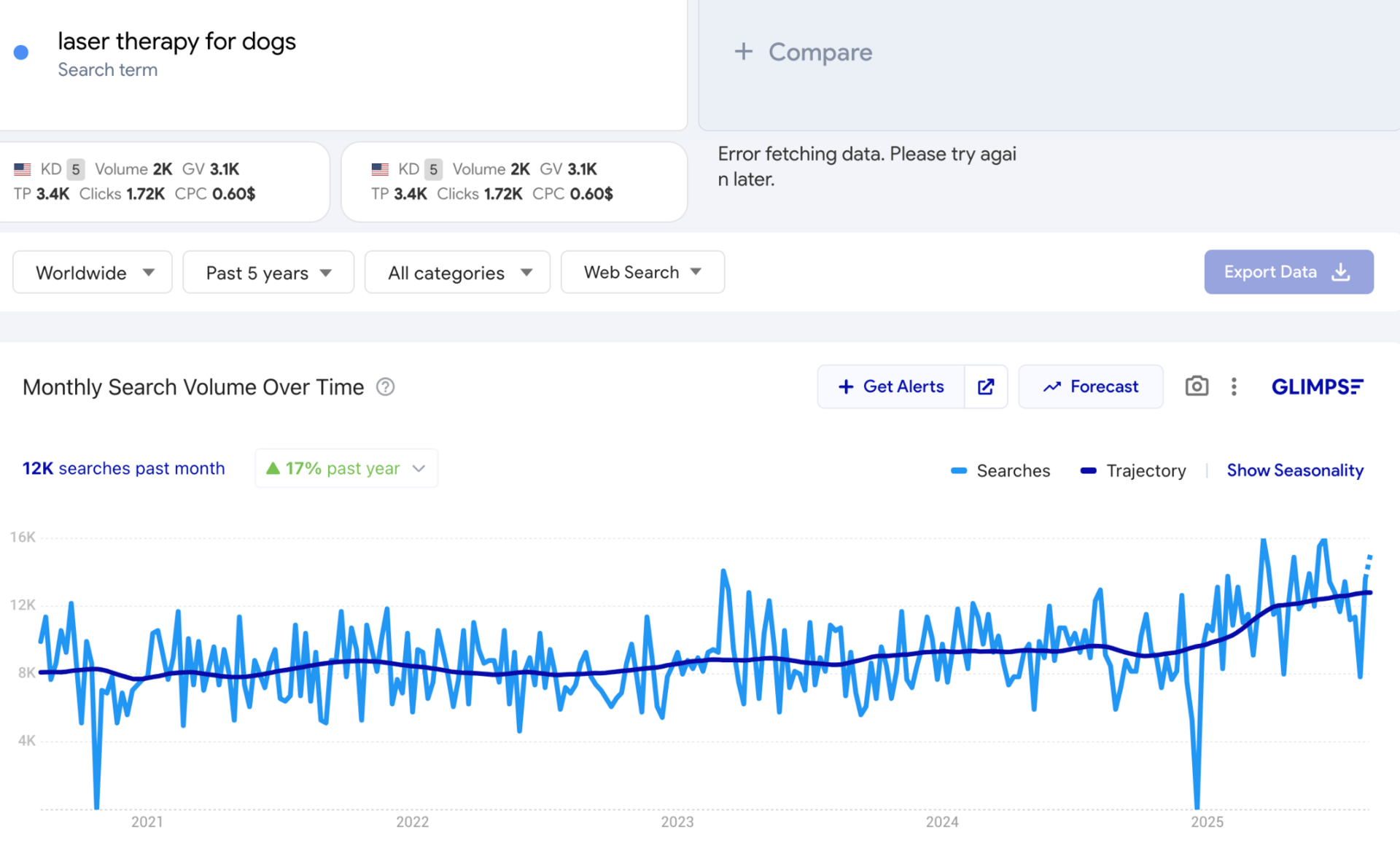Interest in “laser therapy for dogs” is climbing, not spiking.