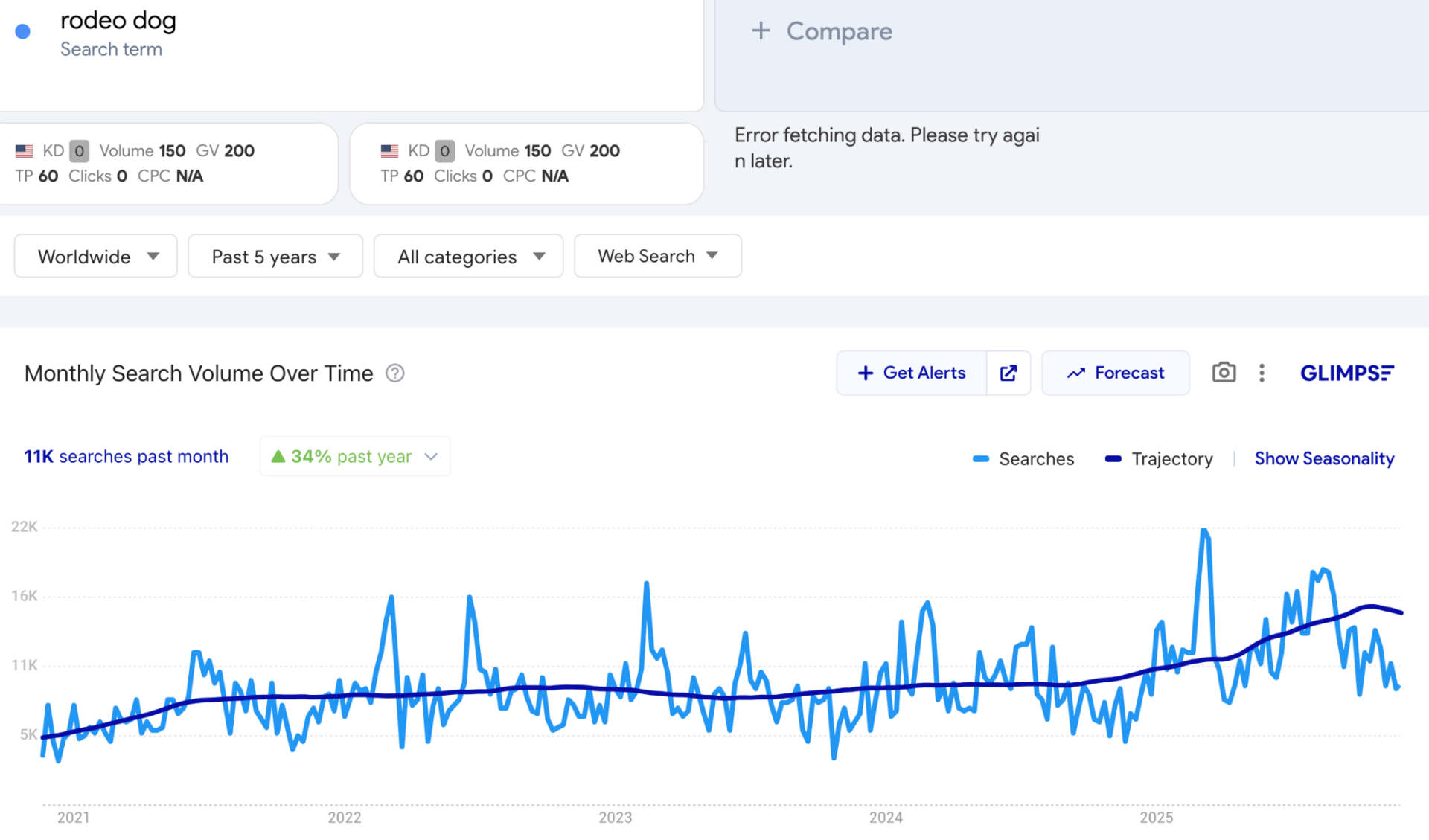 Interest in “rodeo dog” has climbed steadily over the past five years, moving from a fringe curiosity to a small but consistently growing search category.