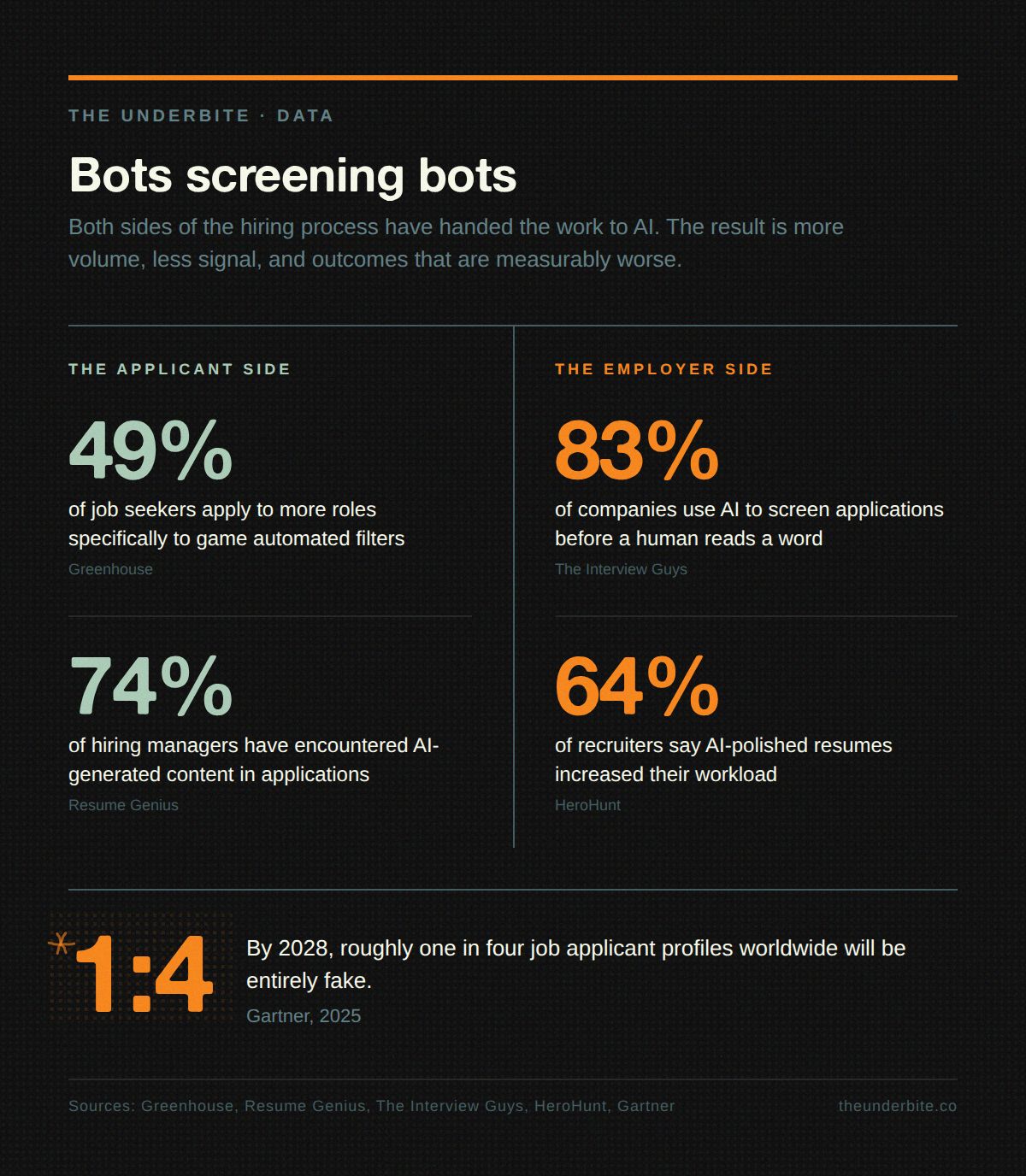 On the other end, 83% of companies now use AI to screen the applications that arrive, filtering, ranking, and eliminating candidates before a human being has read a single word.