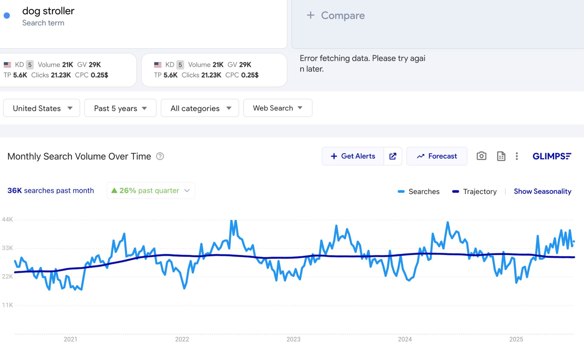What’s interesting is that despite these predictable seasonal dips, the baseline demand stays strong. Last month alone saw around 36K searches, and that’s up 26% compared to the previous quarter.