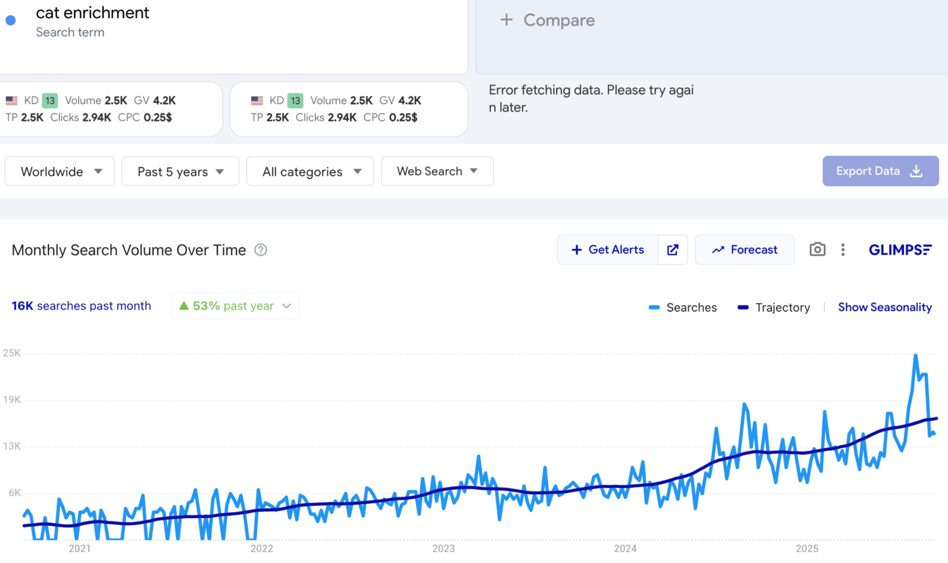 Search interest in “dog divorce” is small but climbing: ~10K searches last month, up ~29% YoY.