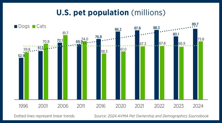 From 1996-2024, the dog population has steadily increased, from 52.9 million to a new peak of 89.7 million.